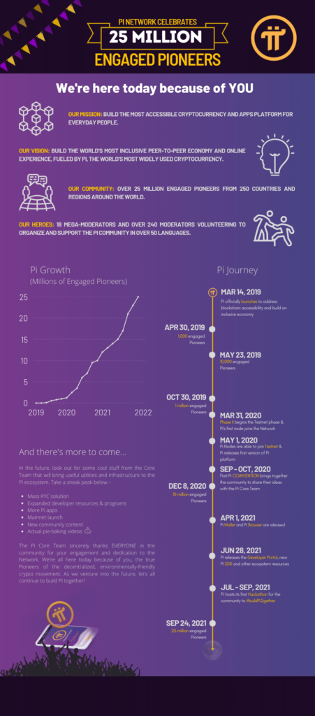 We are here today because of you! Pi Network has grown to over 25 million Engaged Pioneers – check out this informative infographic to learn more about Pi’s journey.